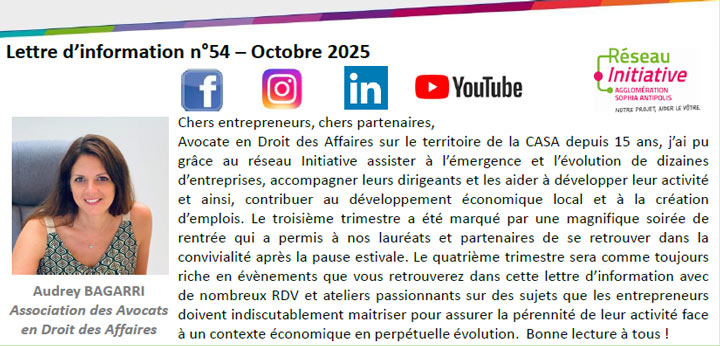 Avocate en Droit des Affaires sur le territoire de la CASA depuis 15 ans, j’ai pu grâce au réseau Initiative assister à l’émergence et l’évolution de dizaines d’entreprises, accompagner leurs dirigeants et les aider à développer leur activité et ainsi, contribuer au développement économique local et à la création d’emplois Le troisième trimestre a été marqué par une magnifique soirée de rentrée qui a permis à nos lauréats et partenaires de se retrouver dans la convivialité après la pause estivale Le quatrième trimestre sera comme toujours riche en évènements que vous retrouverez dans cette lettre d’information avec de nombreux RDV et ateliers passionnants sur des sujets que les entrepreneurs doivent indiscutablement maitriser pour assurer la pérennité de leur activité face à un contexte économique en perpétuelle évolution.