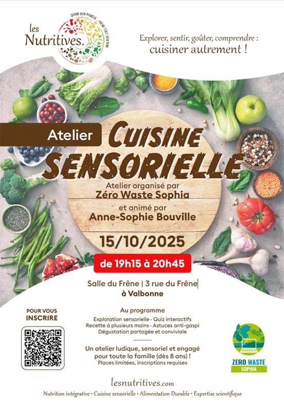 Partez à la découverte d’une cuisine sensorielle et d’une alimentation durable avec Anne-Sophie Bouville, docteure en sciences et passionnée de l’univers sensoriel mercredi 15 octobre de 19h15 à 20h45, salle 3 rue du Frêne.