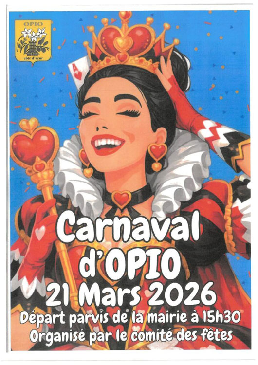 Participez déguisés au Carnaval d'Opio le 21 Mars départ sur le parvis de la Mairie à 15h30, descente en fanfare jusqu'au "Cœur de Village" pour la bataille de confettis et enfin bruler le Roi....