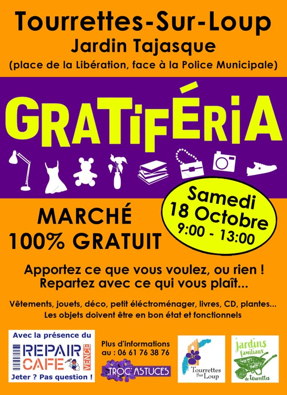 La Gratiféria se déroulera au Jardin Tajasque (face à la Police Municipale, sur la place de la Libération). Venez nombreux !
