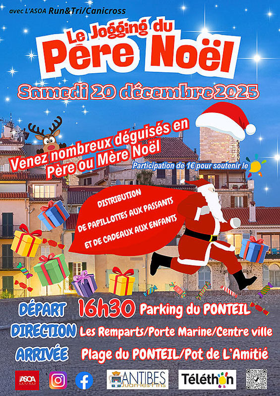Samedi 20 décembre, l'ASOA Run&Tri Canicross vous invite à participer au "Jogging du Père Noël" dans les rues d'Antibes.