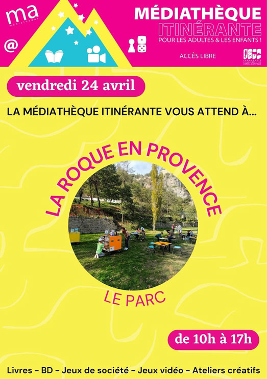 Le24avrilde10h00 à 17h00LieuParc communal de la Roque-en-ProvenceLa Roque-en-ProvenceCULTURE, PETITE ENFANCEMédiathèque itinéranteAjouter à mon calendrierLivres - BD - Jeux de société - Jeux vidéo - Ateliers créatifs...Sélection de la vue© OpenStreetMap contributorsFermerPrécédentRetour à la listeSuivant