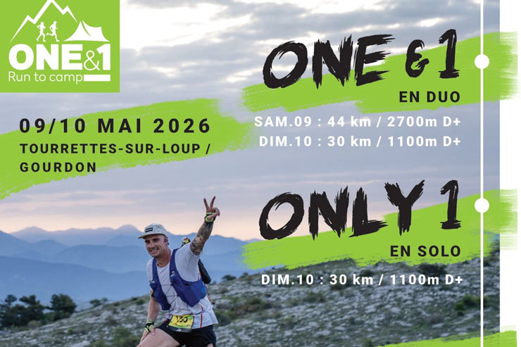 Le ONE & 1 c’est 2 jours de course en équipe de deux ! Les coureurs devront réaliser une première étape de 43 km de long depuis Tourrettes jusqu’au bivouac établi à Gourdon. Le parcours prévoit 2700m de dénivelé positif. Le lendemain, la seconde étape jusqu’à Tourrettes-sur-Loup se fera sur 30 km et 1100 m de dénivelé positif.